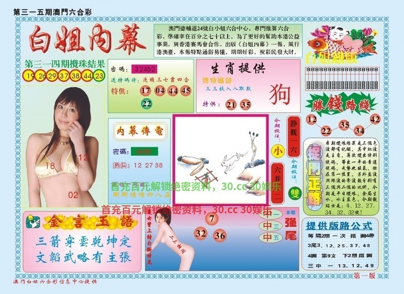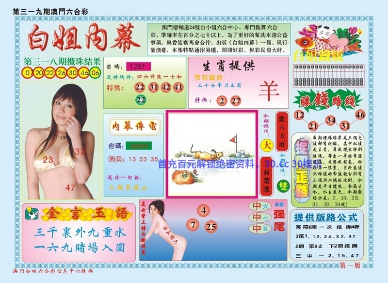 | 320期《白姐九肖》 综合九肖♘:羊鼠狗虎鸡猴马猪龙 综合七肖♘:羊鼠狗虎鸡猴马 综合五肖♘:羊鼠狗虎鸡 主攻特码♘:35.47.06.18.32.44.28.40.33.45 ![]() |